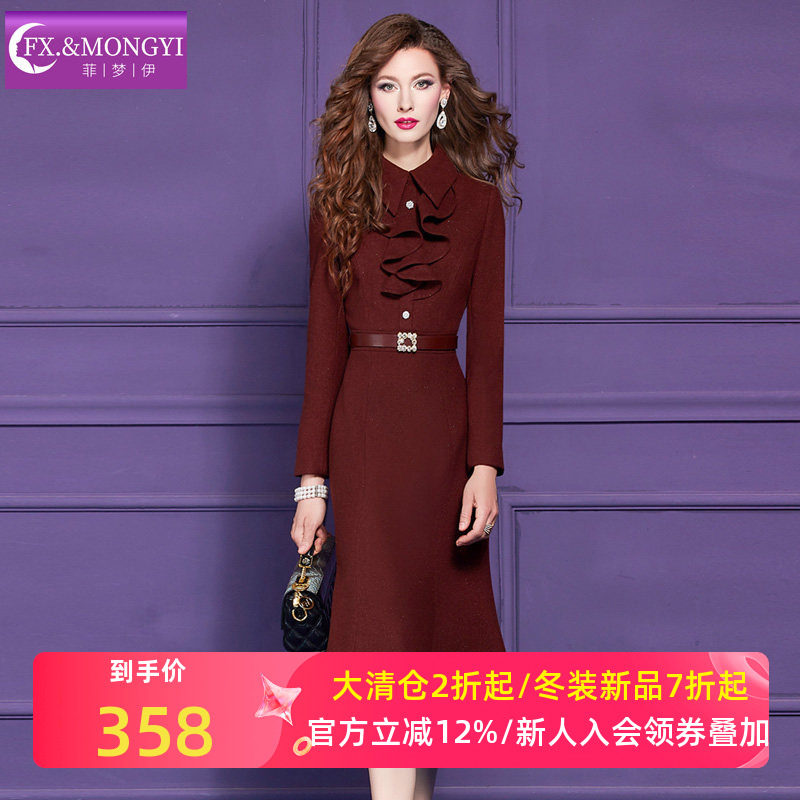 菲梦伊含羊毛荷叶边衬衫连衣裙女冬季复古高端优雅收腰中长款裙子