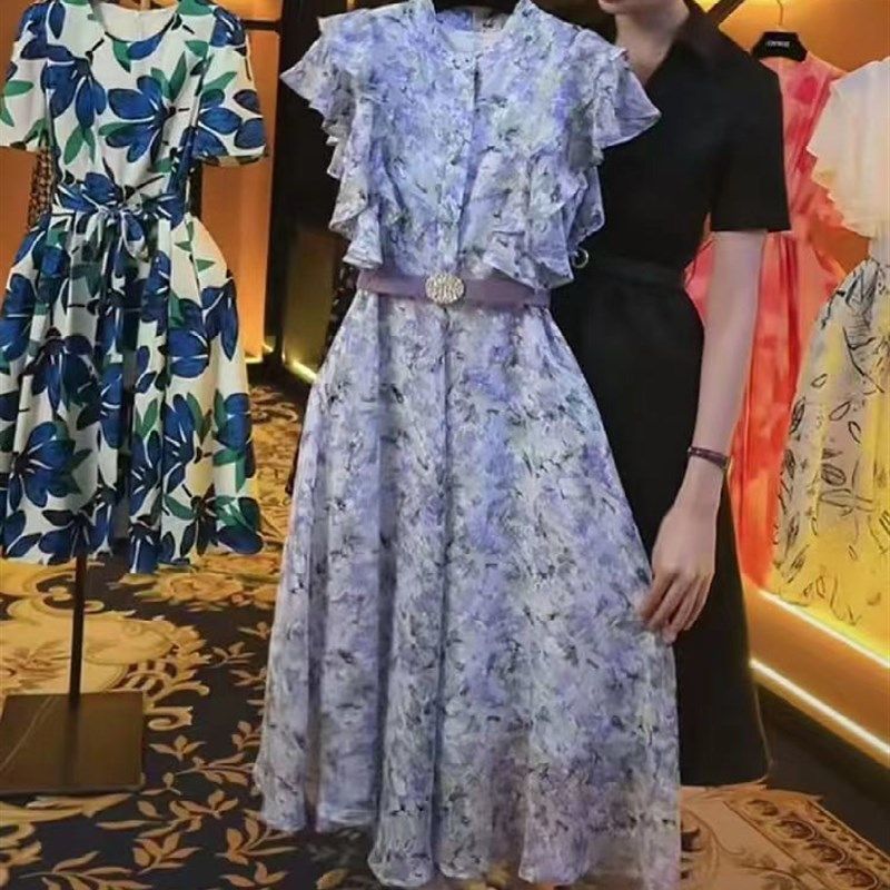 夏季时尚温柔圆领短袖蝴蝶结系带雪纺印花中长款小个子公主连衣裙