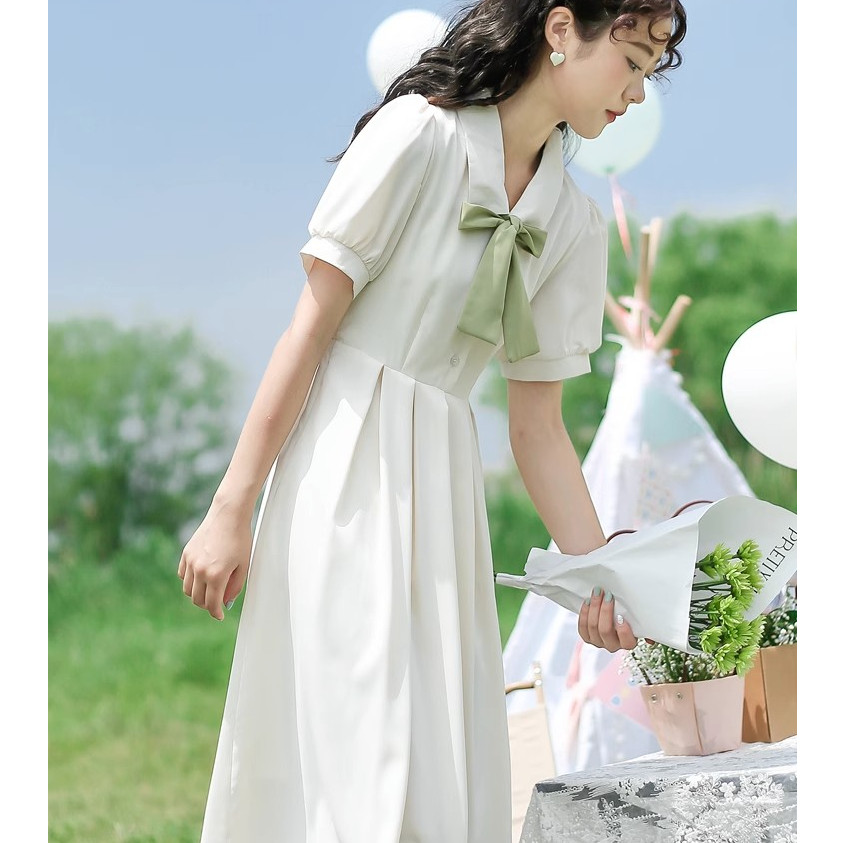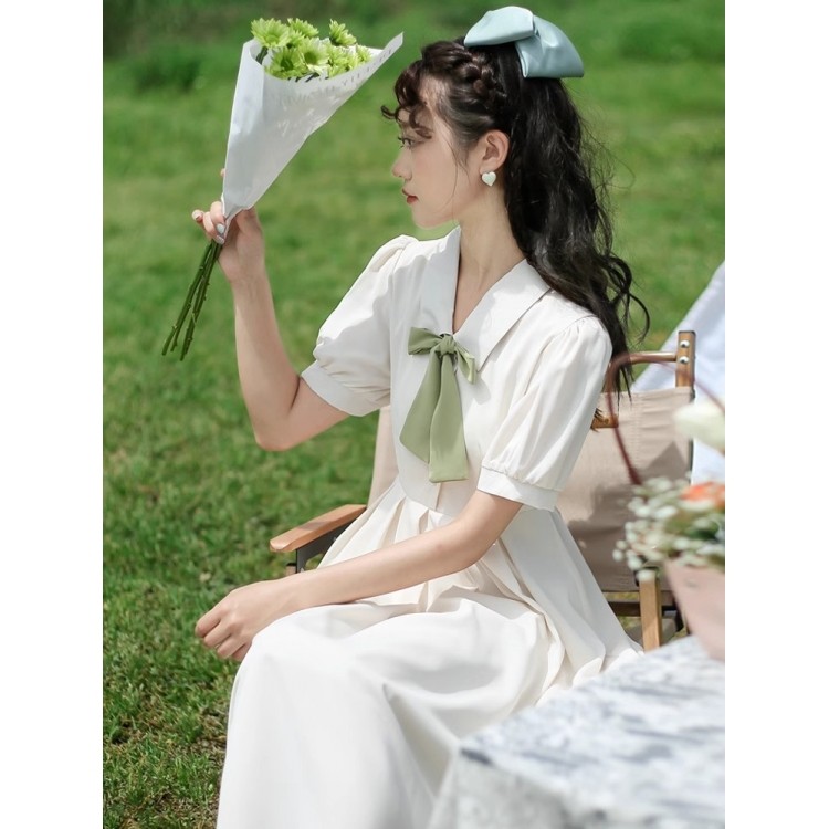 法式文艺蝴蝶结系带短袖连衣裙雪纺裙子女夏季新品学生高腰a字裙