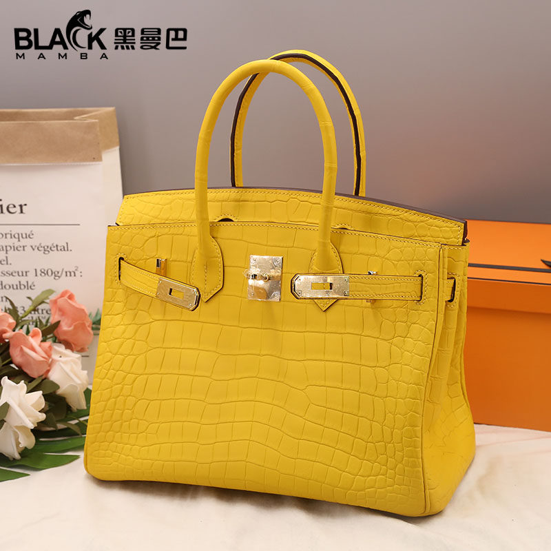 黑曼巴高档鳄鱼肚皮铂金包真皮柠檬黄橙色30CM女士手提包时尚带锁