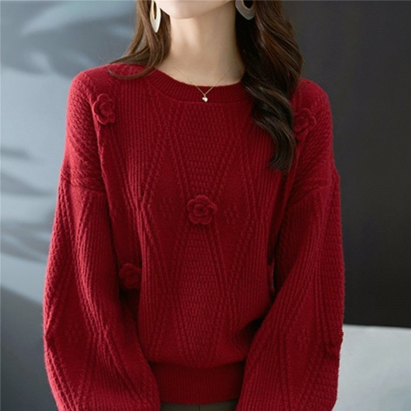 春秋韩版立体花朵圆领套头毛衣女新款小香风减龄宽松灯笼袖针织衫