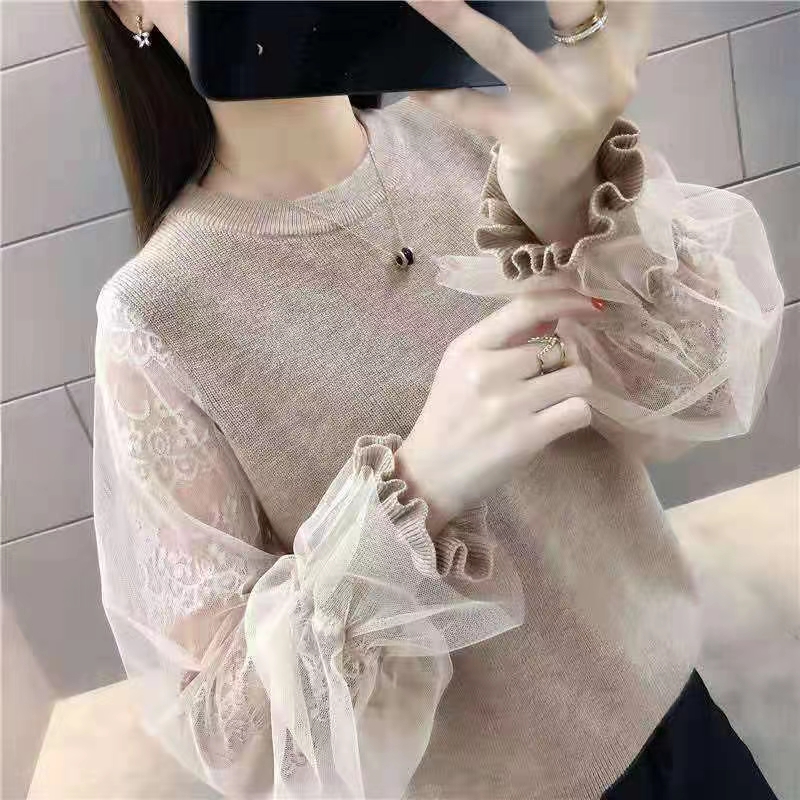 2025春秋新款显瘦网纱针织衫女韩版灯笼袖蕾丝拼接毛衣套头上衣服