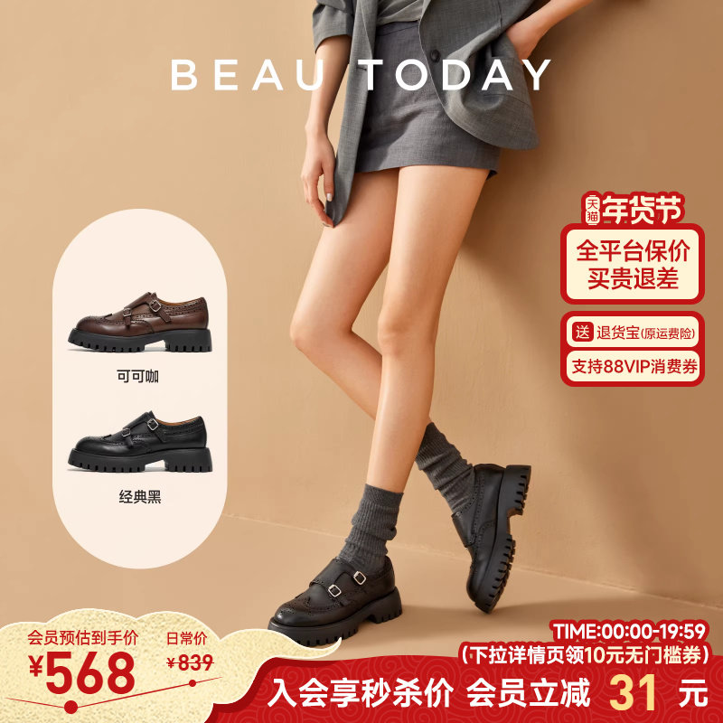 BeauToday厚底乐福鞋女秋季新款真皮布洛克雕花女鞋英伦风孟克鞋