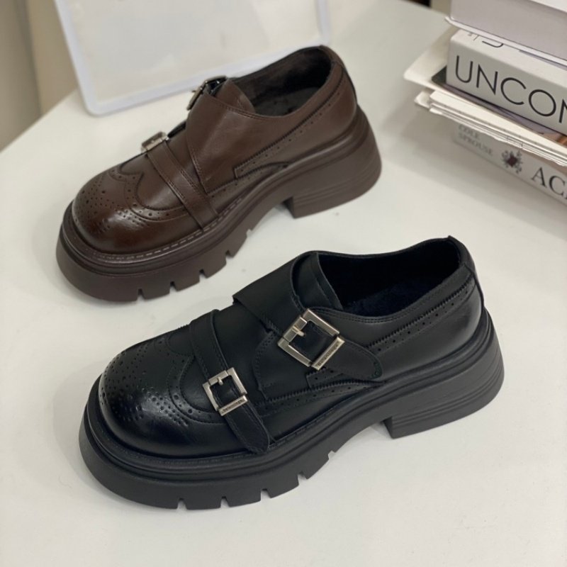 牛皮版~英伦风布洛克雕花双扣带乐福鞋女大头黑色厚底加绒小皮鞋