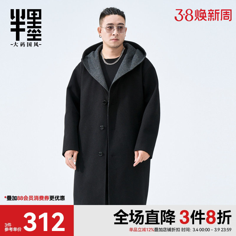半墨中长款毛呢大衣男连帽宽松2025冬季新款撞色风衣外套大码男装