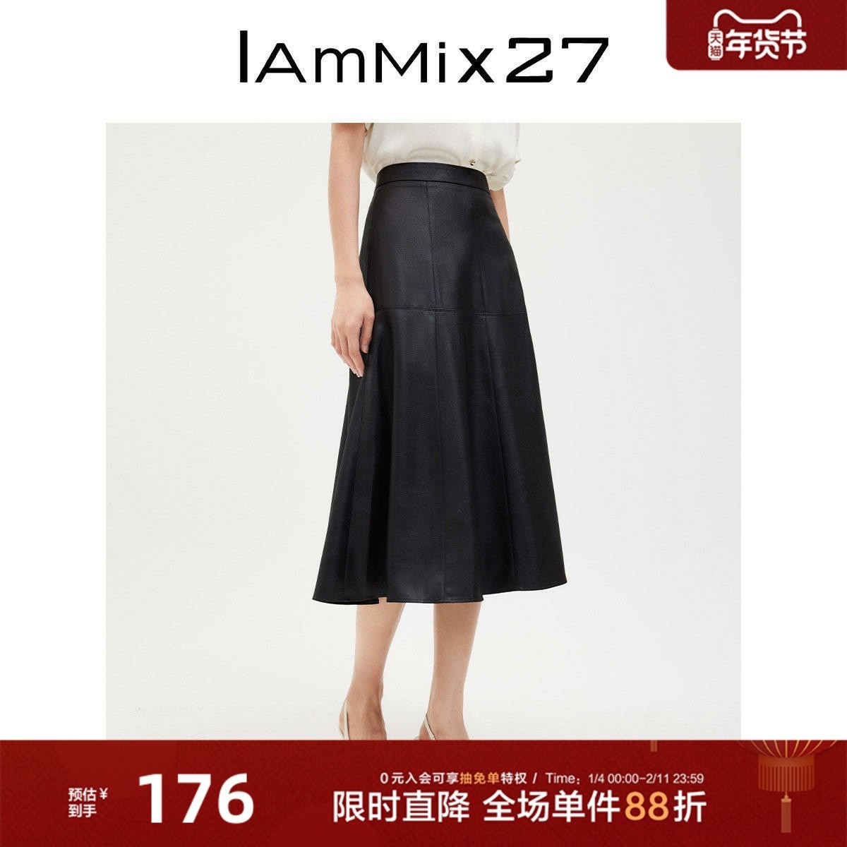 IAmMIX27春秋黑色PU皮裙女高腰显瘦中长款气质简约包臀半身长裙女