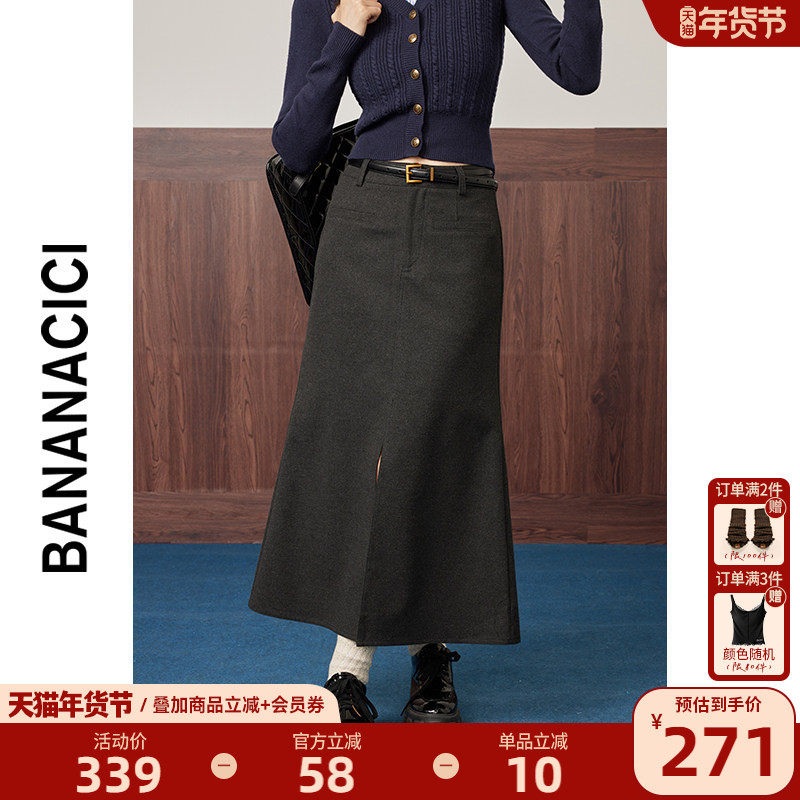 BANANA CICI2025年冬季复古鱼尾前开衩高腰长款包臀半身长裙