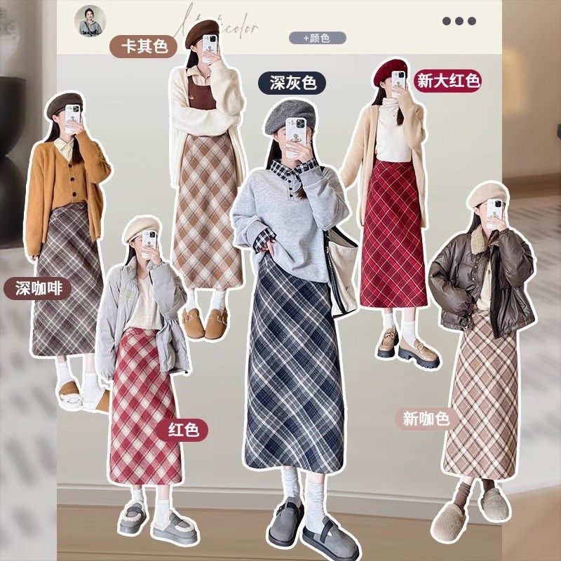 加绒毛呢格子裙女秋冬2025新款高腰a字修身红色格子包臀半身长裙