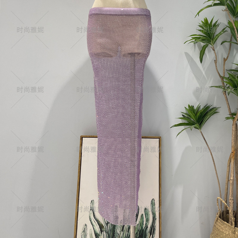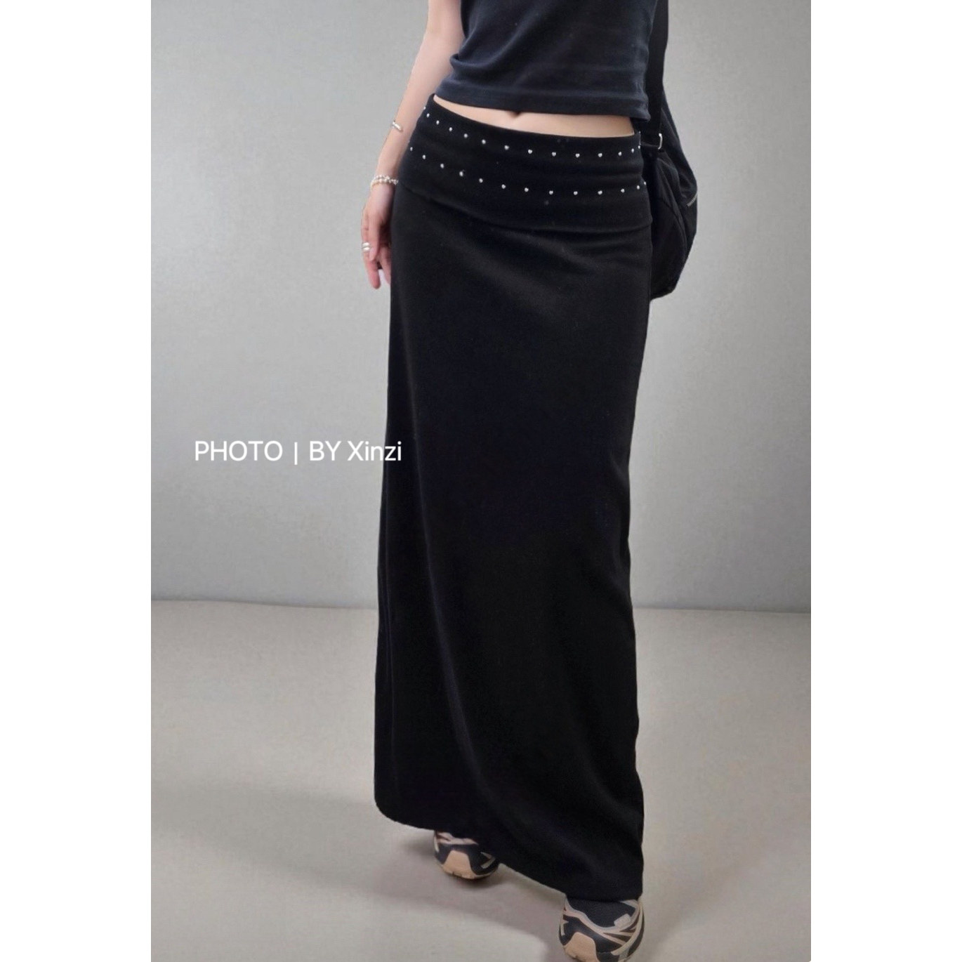 辛子韩国代购纯欲辣妹风高腰包臀半身长裙女修身铆钉拼接垂感长裙