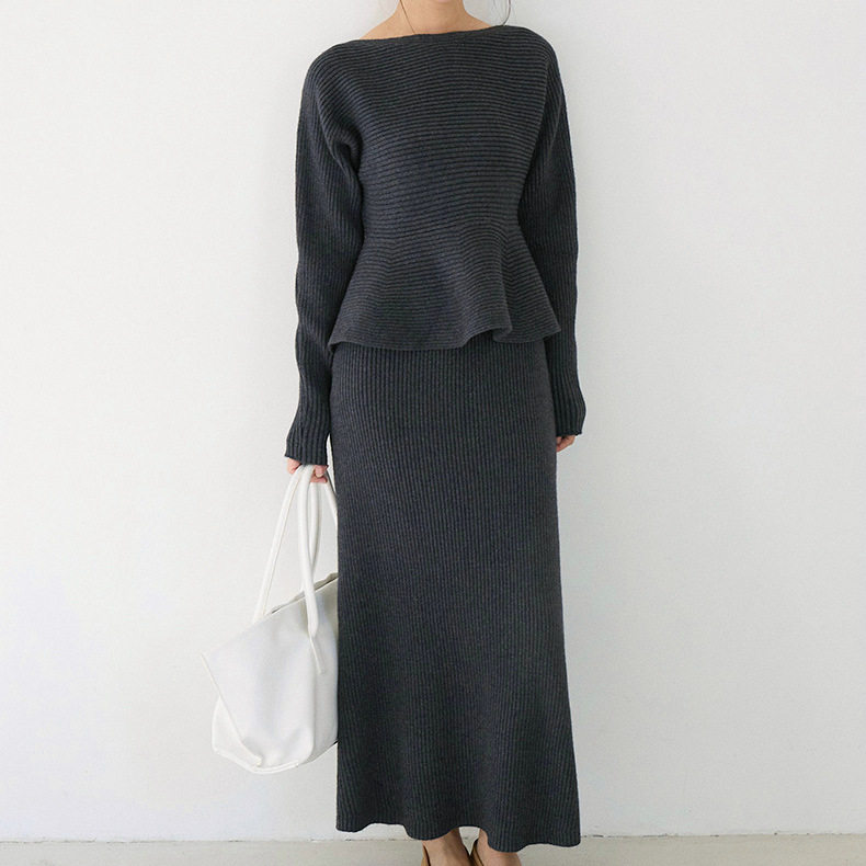 2026春季荷叶边下摆一字领毛衣针织包臀半身长裙两件套女装配腰带