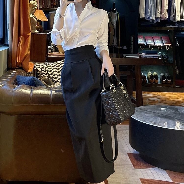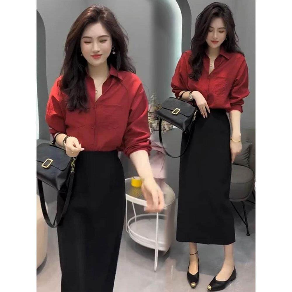 赫本风复古两件套宽松百搭衬衫上衣包臀半身长裙显瘦中长款套装女