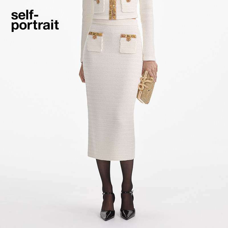 self-portrait 2025早春象牙白金色钻饰针织包臀半身长裙