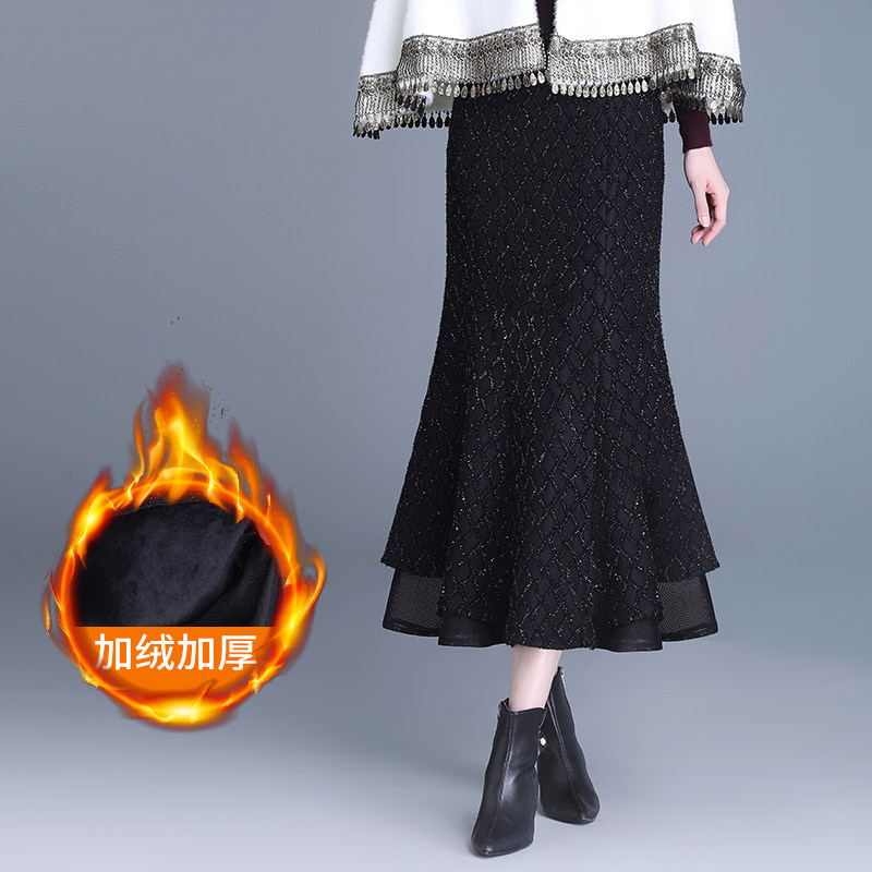 加绒加厚不规则网纱边鱼尾裙时尚小香风亮丝格子包臀半身长裙冬季