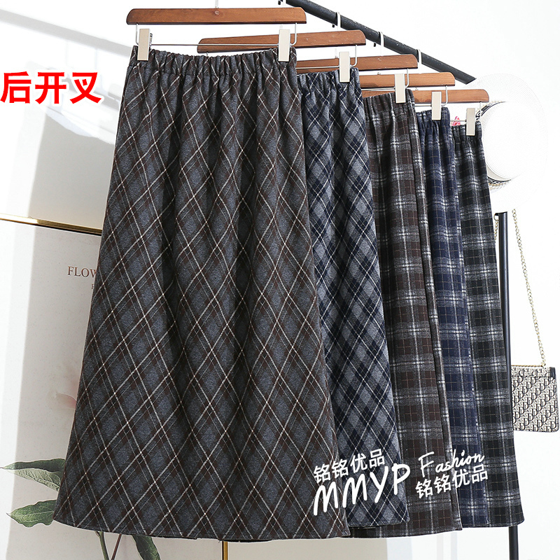 大码微胖MM毛呢半身裙秋冬复古短裙女高腰A字格子包臀裙梨形身材