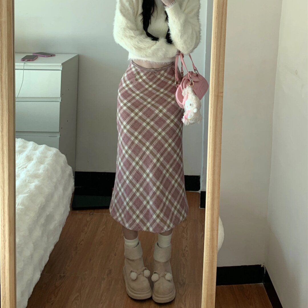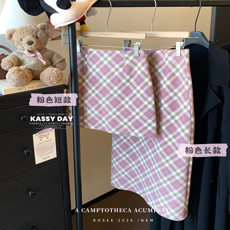 学院风格纹毛呢短裙女秋冬氛围感粉色格子包臀裙甜美a字一步长裙