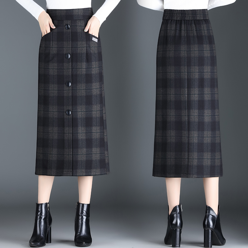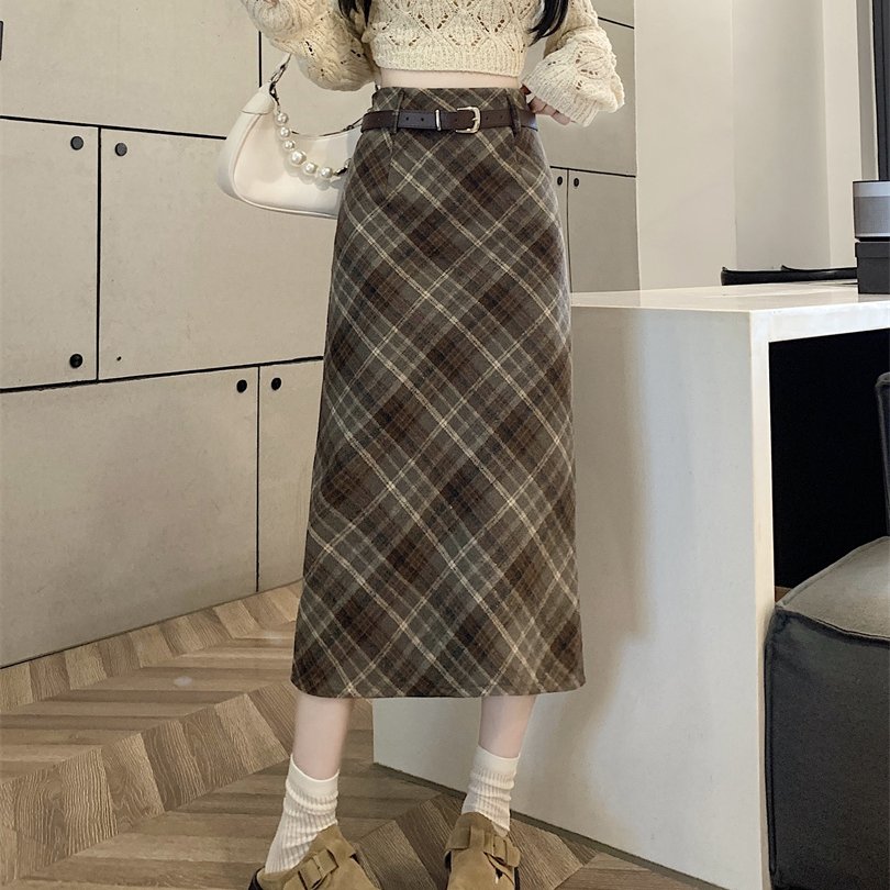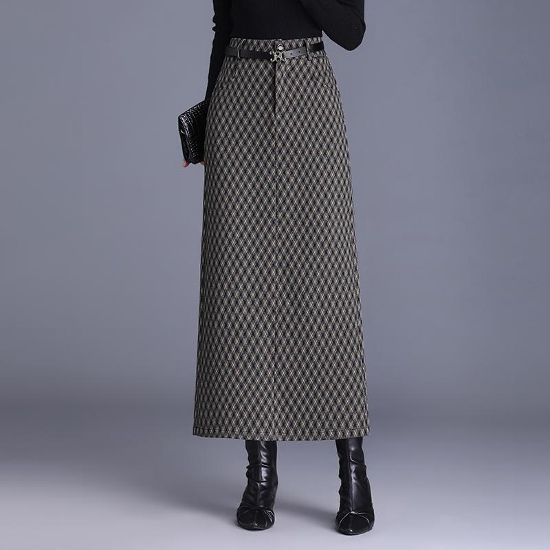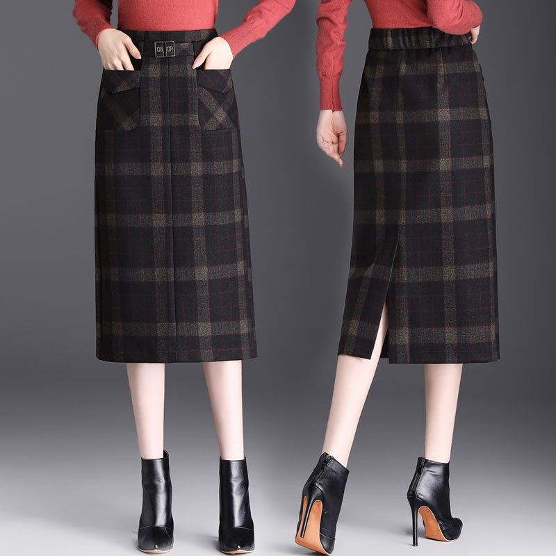 复古毛呢格子半身裙女高腰显瘦开叉直筒秋冬季加厚加绒包臀长裙子