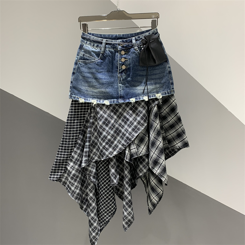 2025年秋季新款设计感不规则拼接格子包臀裙女辣妹a字牛仔半身裙