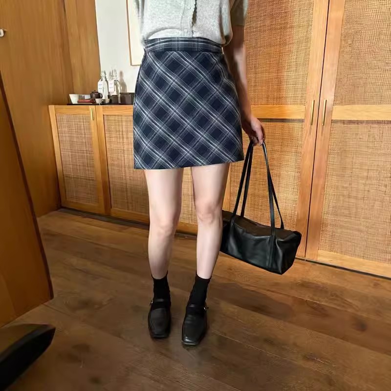 2025年秋季新款氛围感毛呢半身裙女小个子短裙高腰a字格子包臀裙