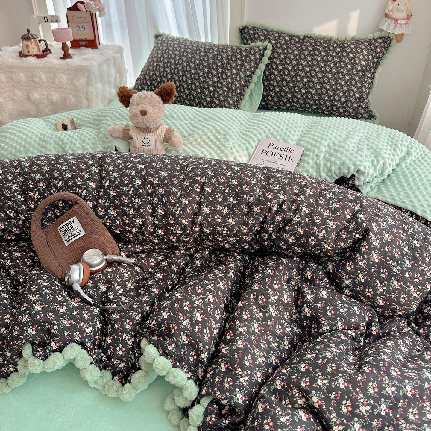 豆豆绒球球绿色碎花四件套全棉宝宝绒A棉B绒1.5m1.8m秋冬床款加大