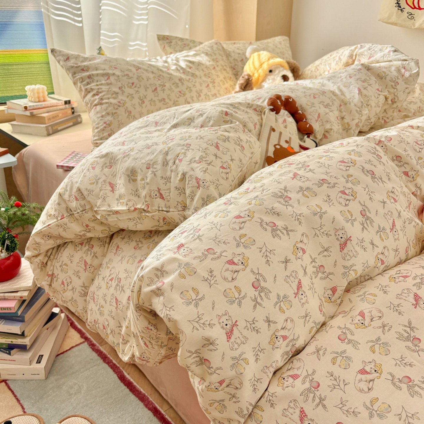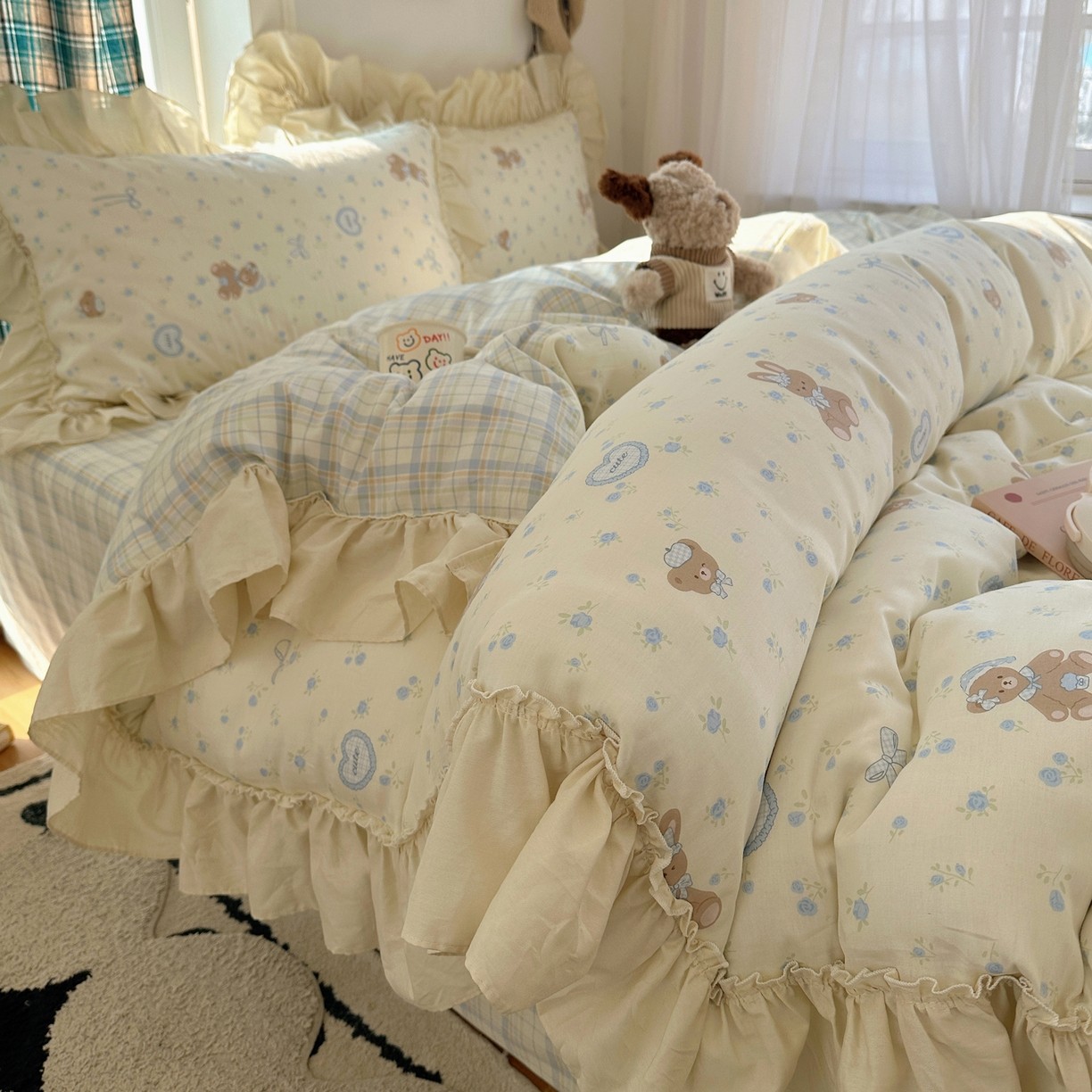 全棉纯棉印花韩系卡通花边四件套奶油色小熊碎花四件套荷叶边卧室