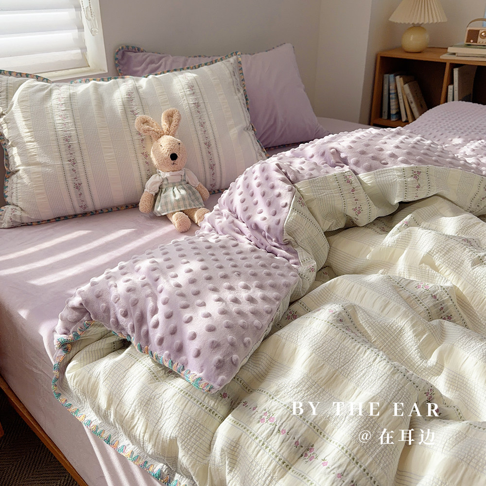 紫小陌秋冬色织提花豆豆绒少女心小碎花四件套1.5m1.8米加厚保暖