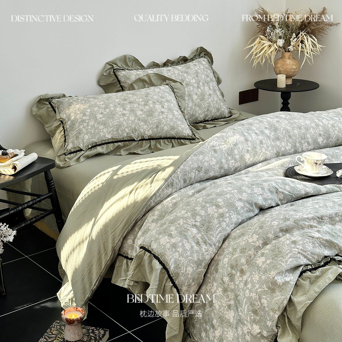 法式橄榄绿小碎花四件套床上用品纯棉亲肤柔软花边被套床单三件套