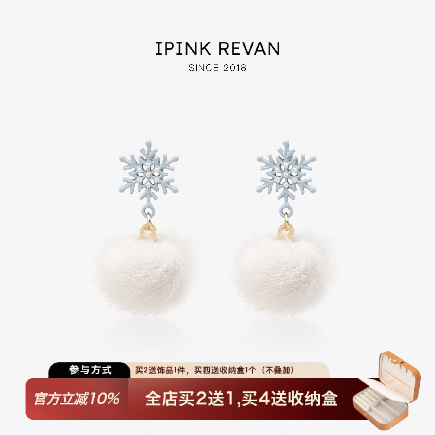 IPINK秋冬清新蓝色雪花毛球耳环超仙氛围感可爱圣诞无耳洞耳夹