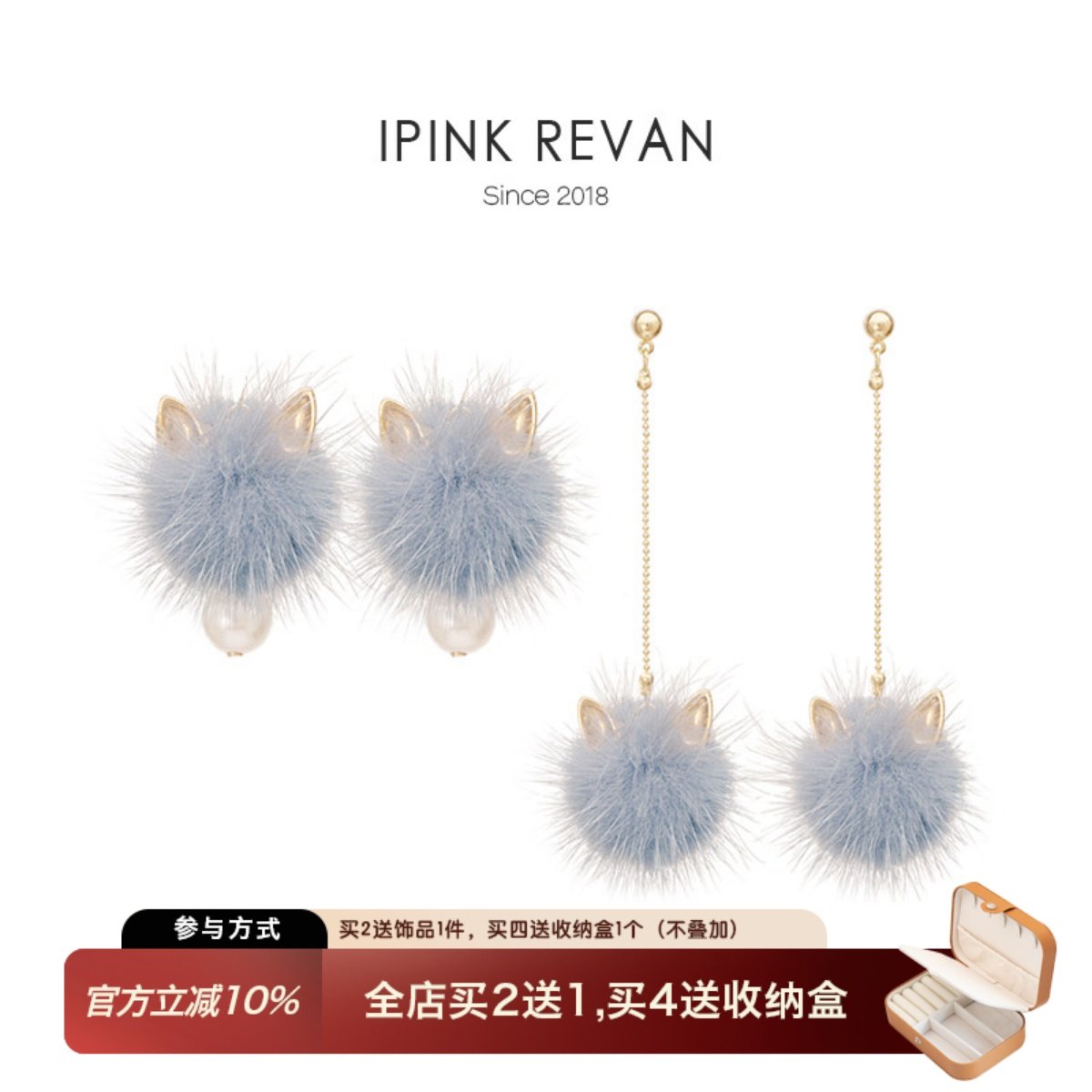 IPINK 猫咪水貂毛毛球耳针耳钉长款圆脸显脸瘦耳环耳夹女620