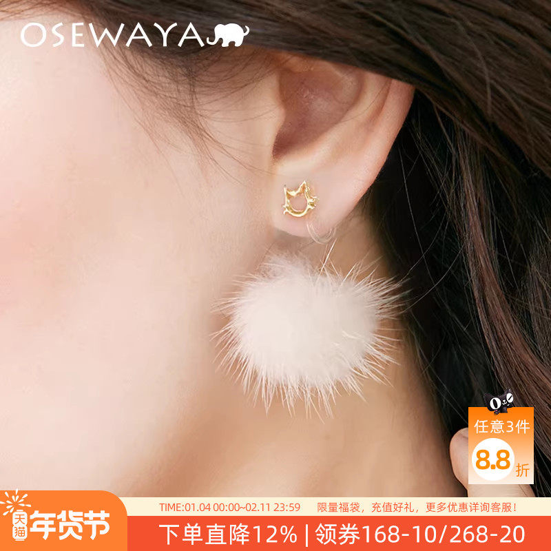 OSEWAYA毛球球耳环女秋冬高级感耳钉猫咪无耳洞耳夹几何猫咪毛绒