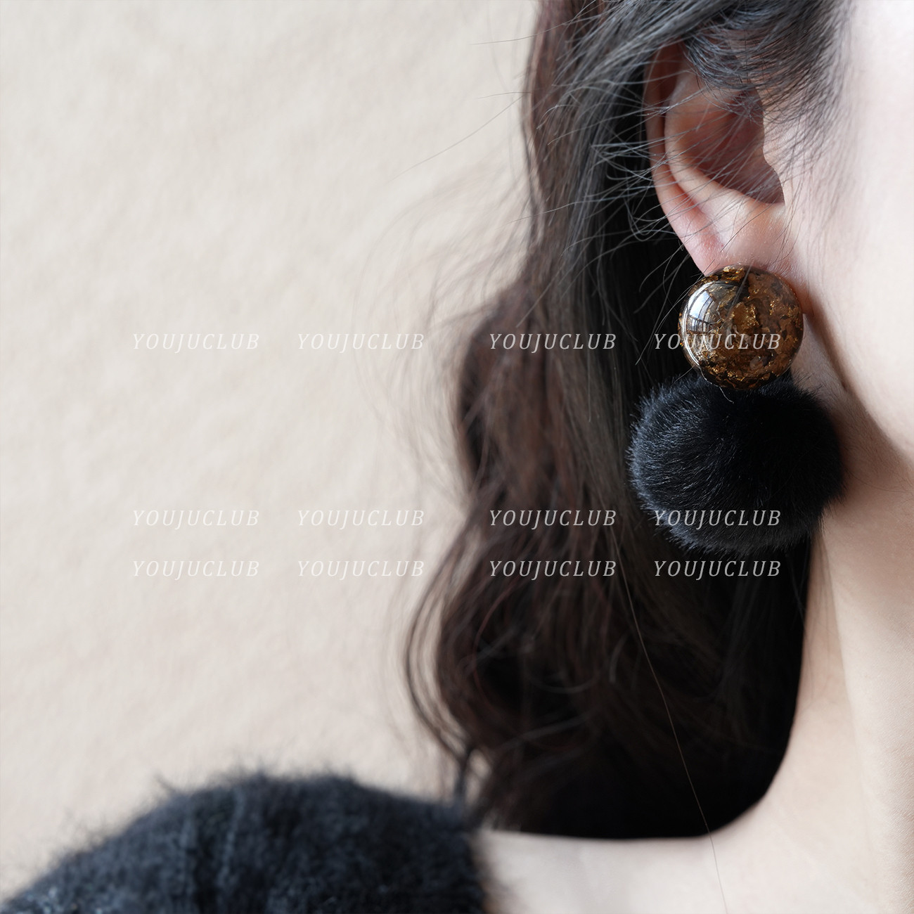 YOUJUclub-金箔毛球~黑色气质简约高级感夸张毛绒冬天耳环耳夹女