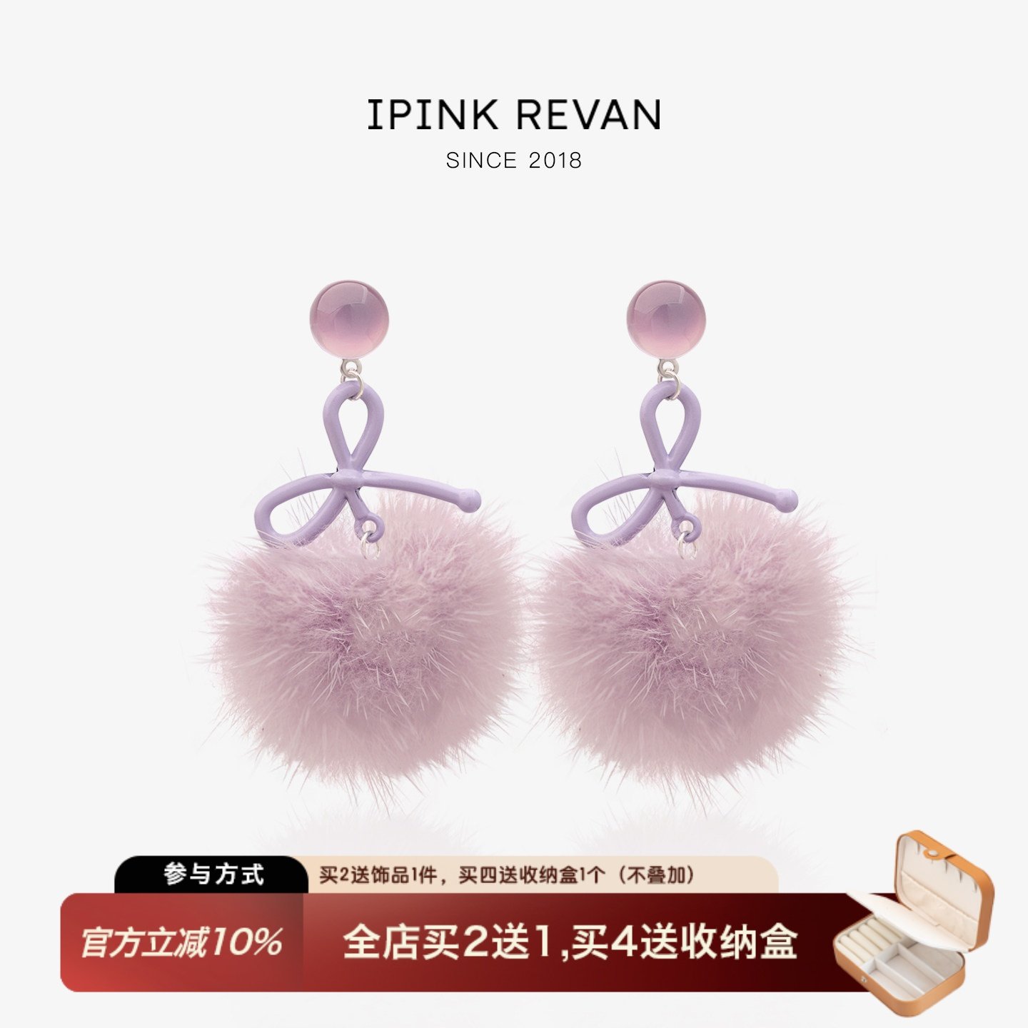 IPINK原创可爱水貂毛绒蝴蝶结耳环女紫色毛球耳饰冬天无耳洞耳夹