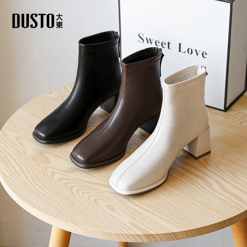 大东白色短靴女2026新款秋冬加绒方头粗跟高跟靴法式靴子切尔西靴