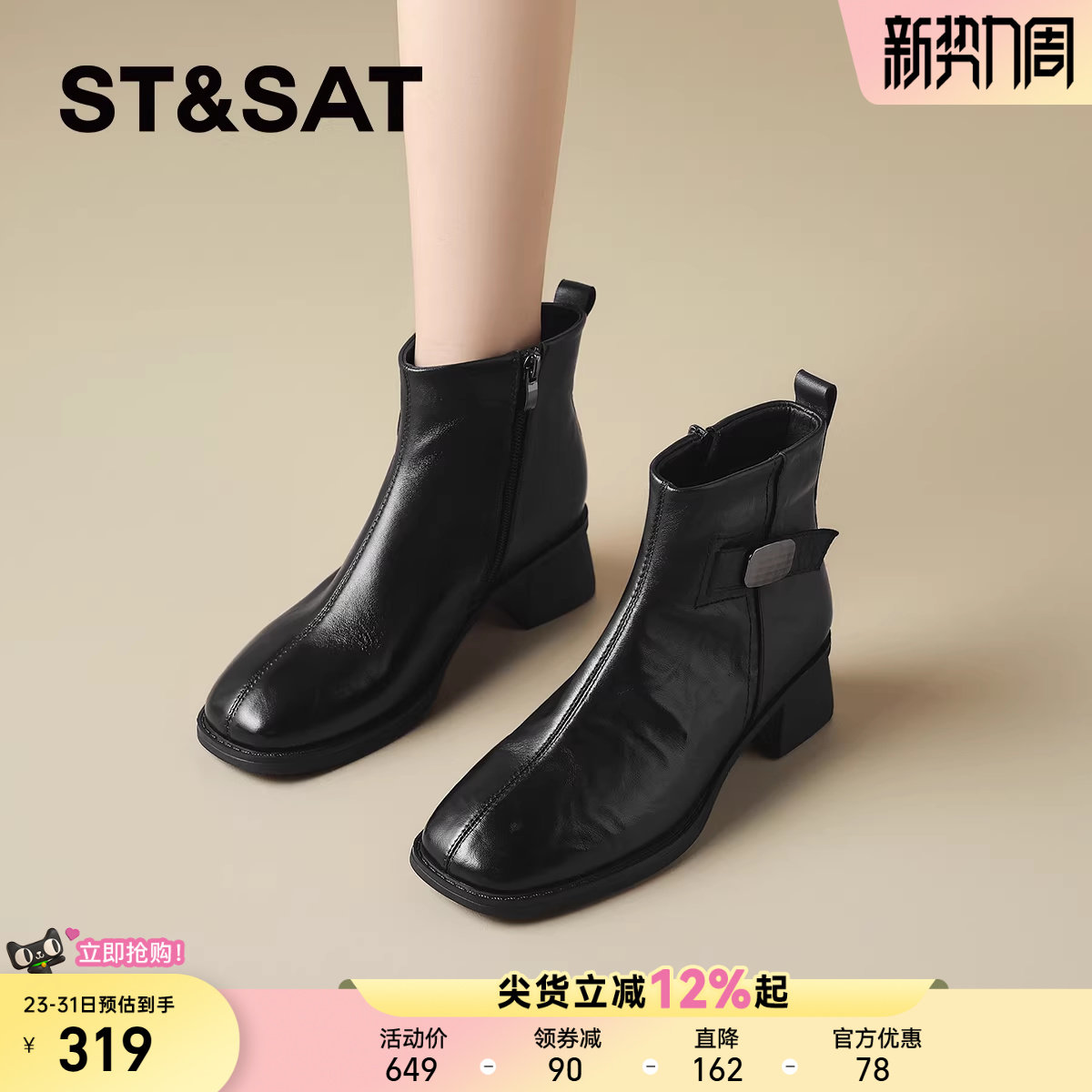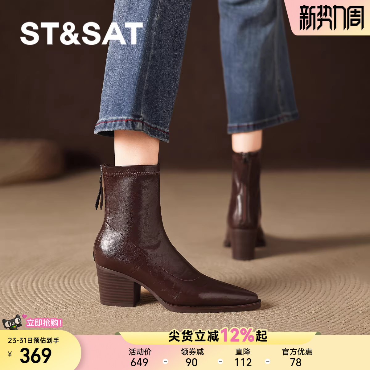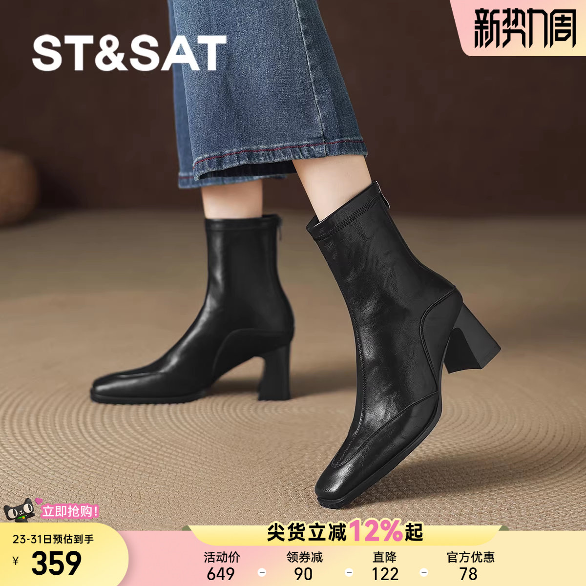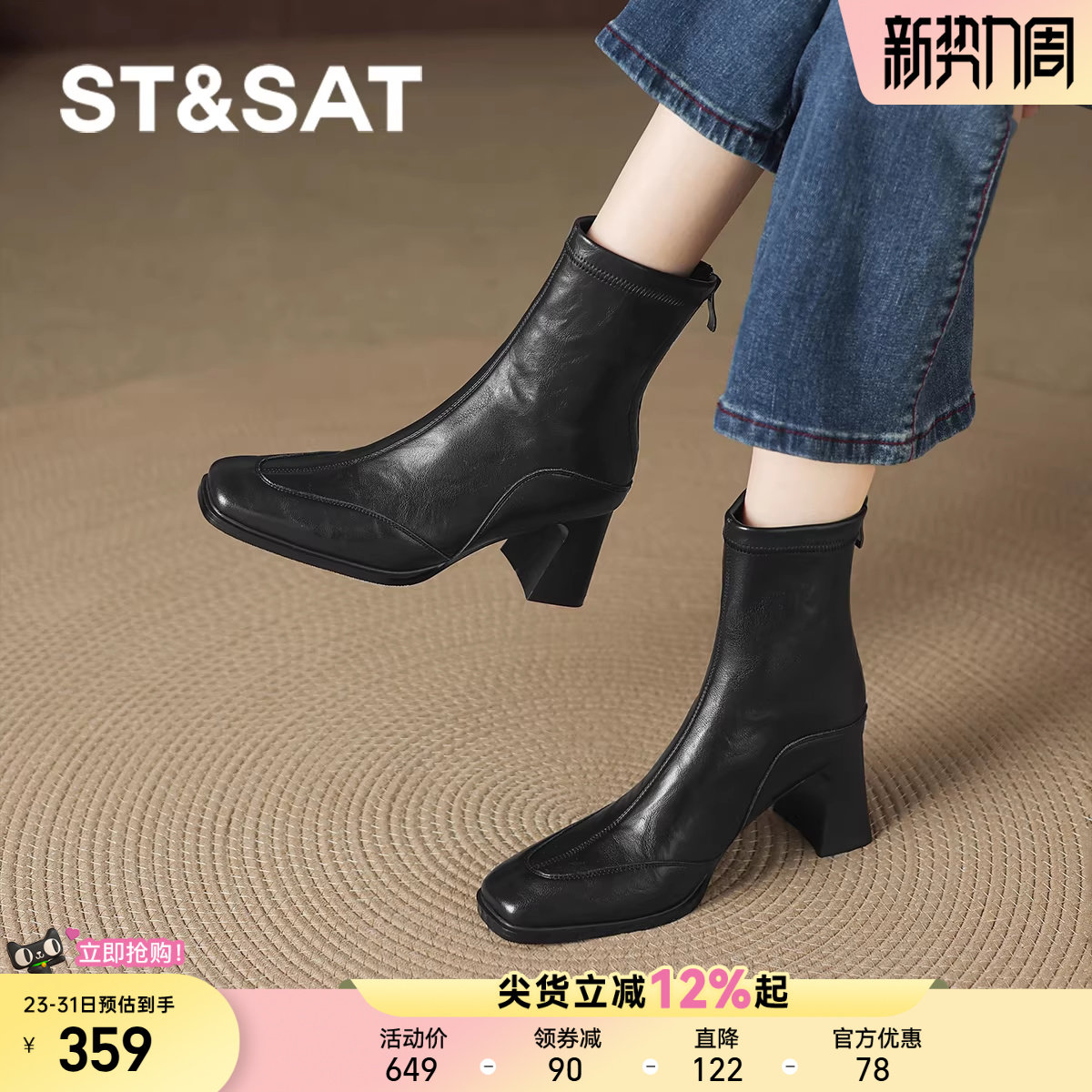 星期六高跟短靴女2025秋冬新款法式气质粗跟瘦瘦靴黑色高级感靴子