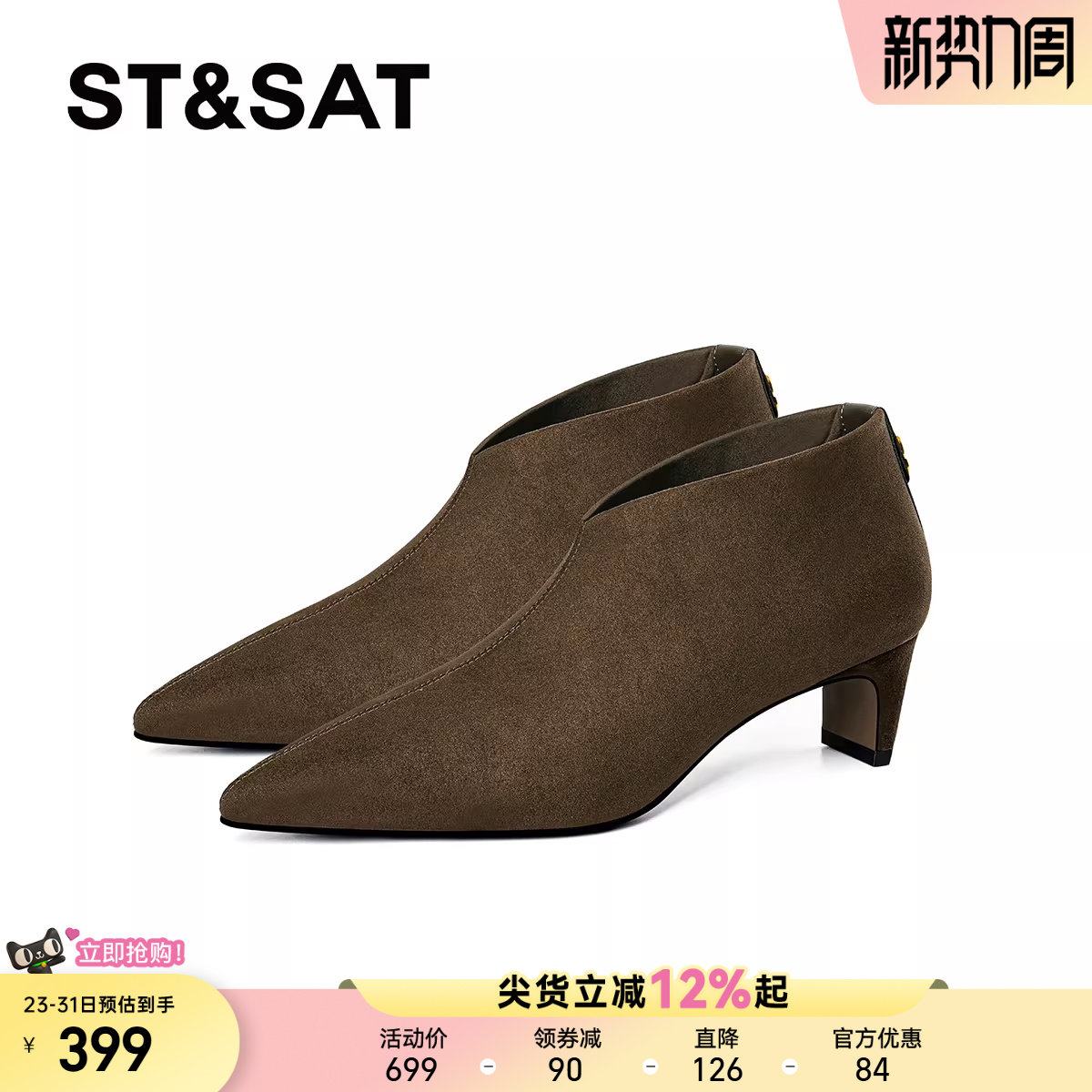 星期六尖头高跟鞋女2025秋冬真皮粗跟绒面磨砂短靴棕色气质瘦瘦靴