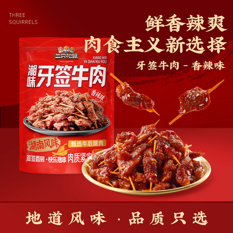 三只松鼠_牙签牛肉香辣解馋小吃办公室宿舍休闲辣味零食开袋即食