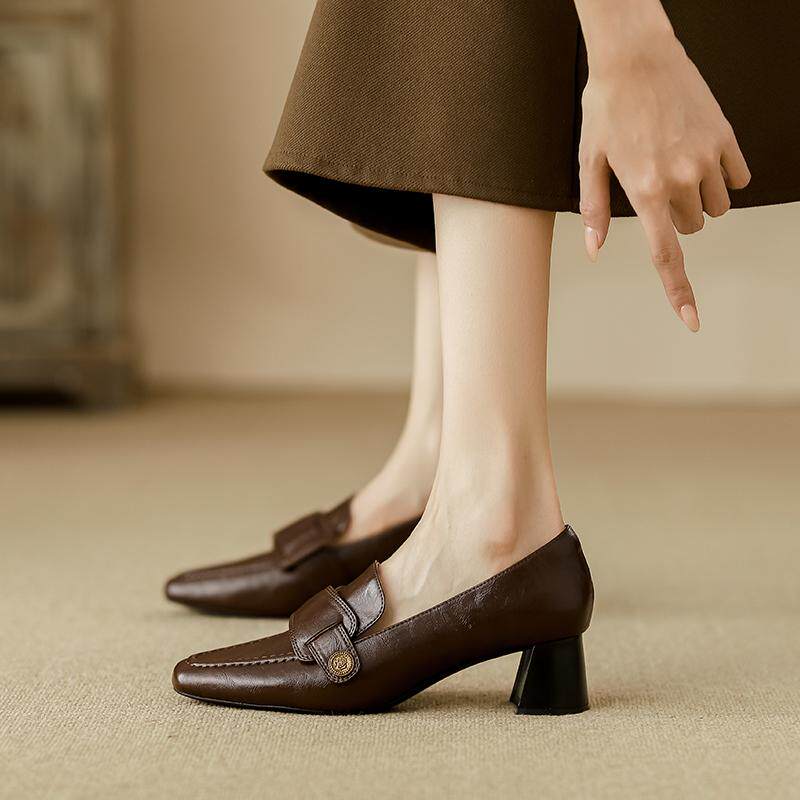 真皮乐福鞋女粗跟2026春秋新款方头复古不累脚工作小皮鞋中跟单鞋