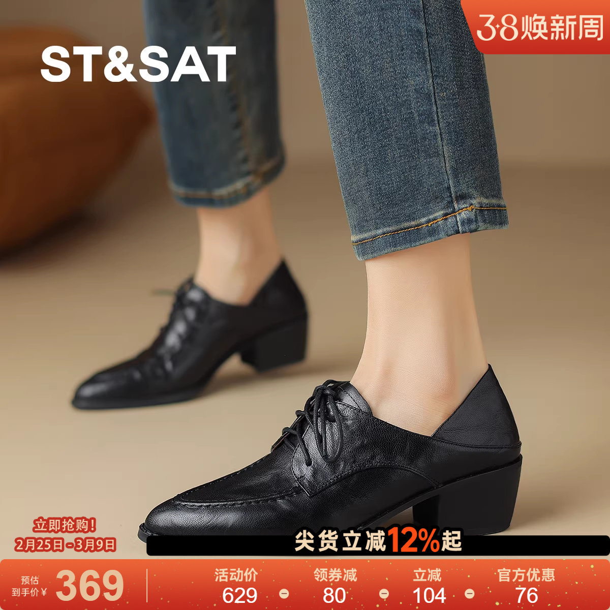星期六英伦风女鞋系带小皮鞋通勤乐福鞋尖头中跟粗跟真皮深口单鞋