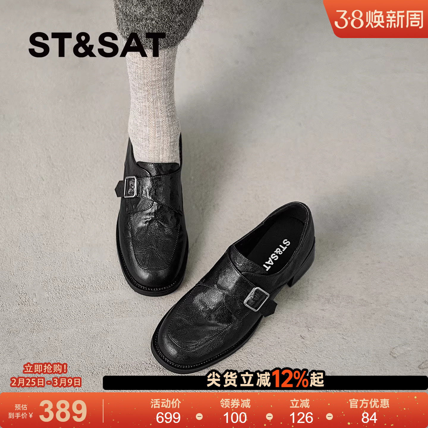 星期六黑色乐福鞋女春软底羊皮粗跟深口单鞋圆头皮带扣中跟小皮鞋
