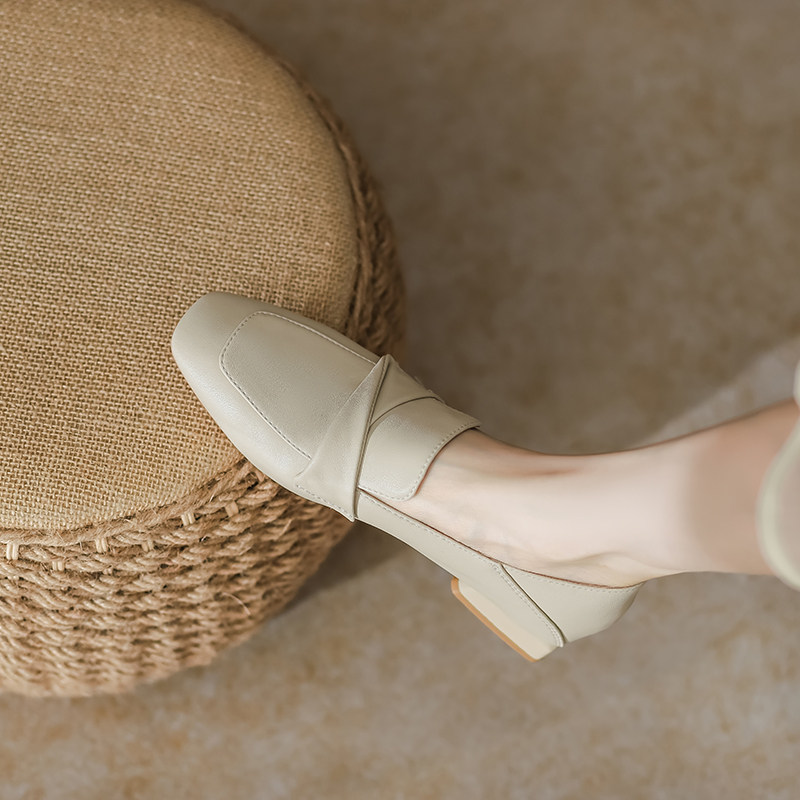 羊皮一脚蹬方头乐福鞋女山茶花春秋中跟粗跟黑色通勤小皮鞋英伦风