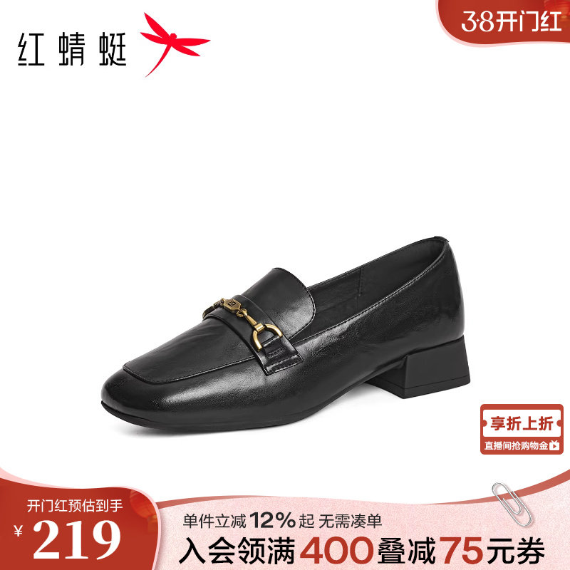 红蜻蜓乐福鞋女春季新款女鞋黑色通勤单鞋气质妈妈鞋子中跟小皮鞋