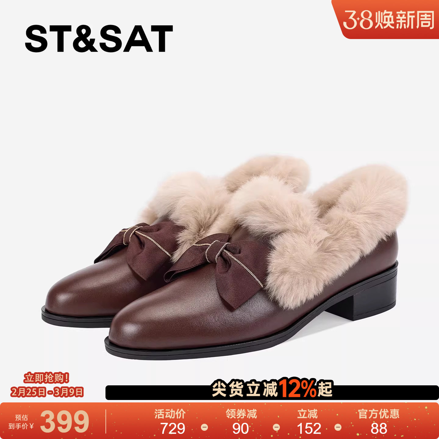 星期六毛茸茸毛毛鞋女2025春季新款蝴蝶结装饰中跟兔毛加绒小皮鞋