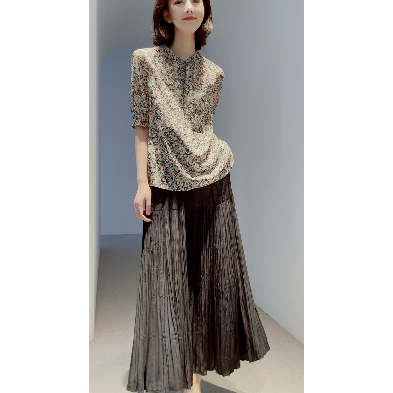 【水纹衫】AUM噢姆夏季收腰修身肌理感真丝衬衫黑色桑蚕丝上衣女