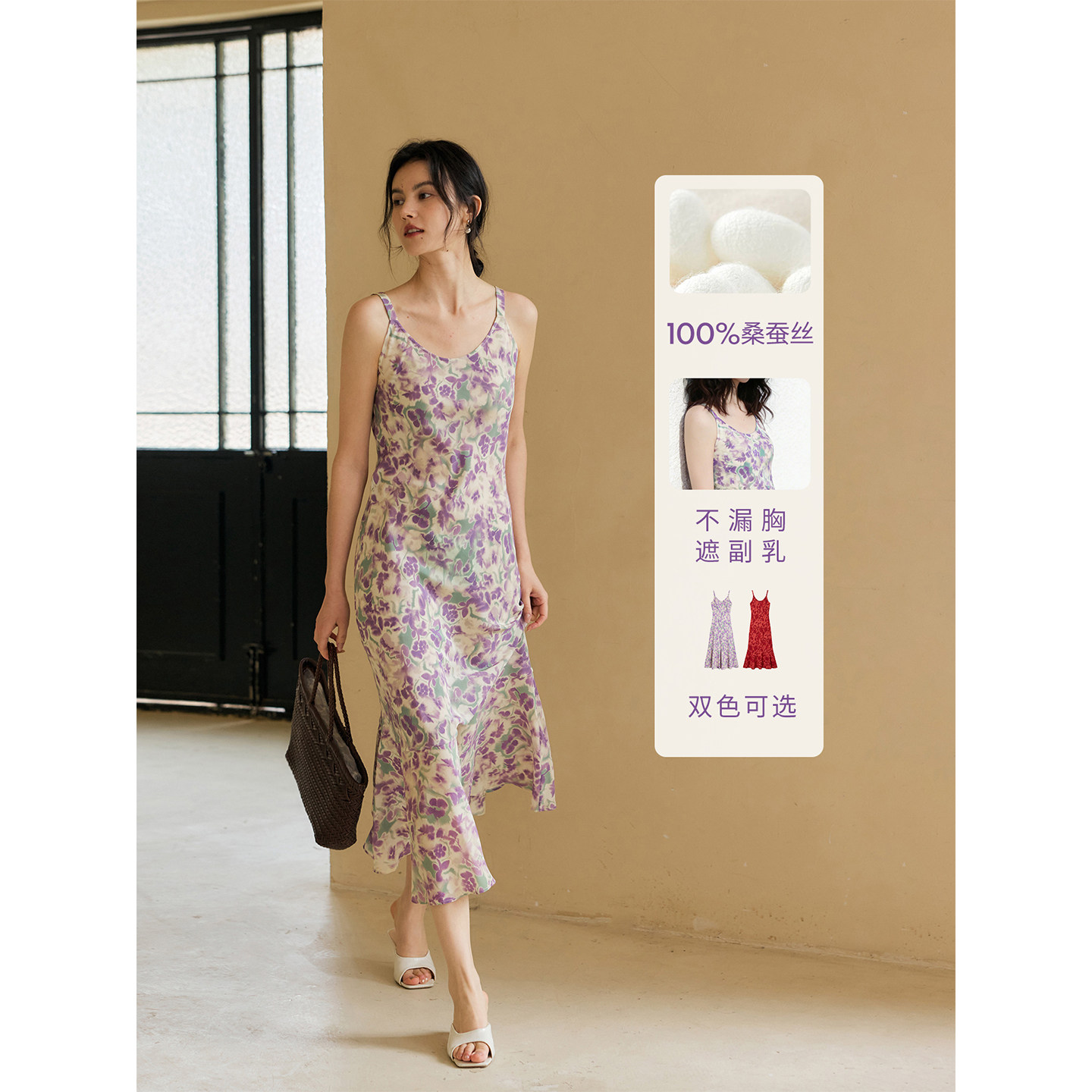 HeyDress100%桑蚕丝印花吊带连衣裙女夏季高级感度假风碎花长裙子