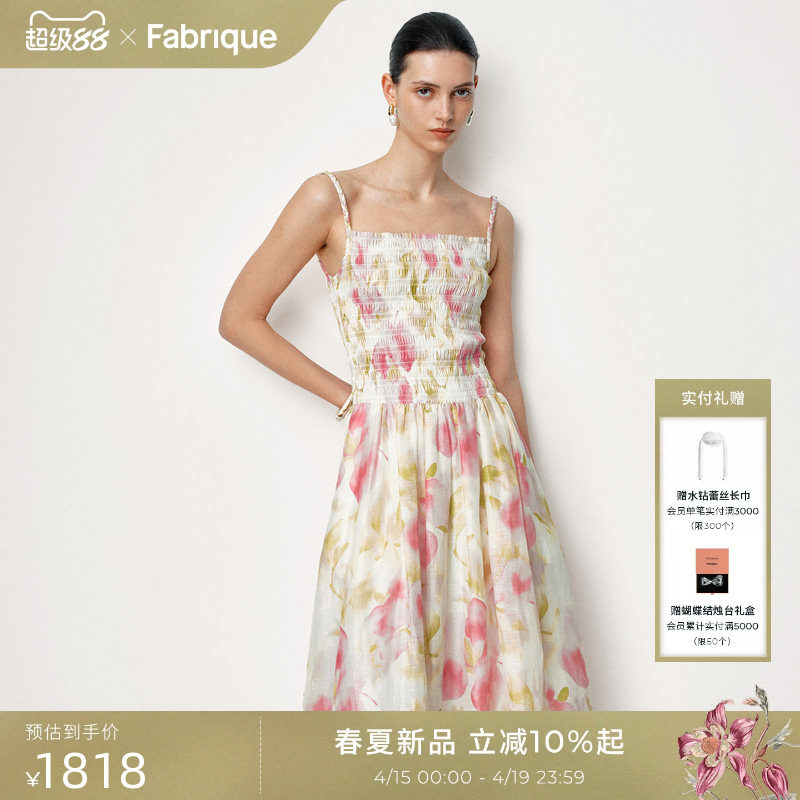 Fabrique 手绘印花桑蚕丝亚麻弹力褶皱吊带连衣裙2026年春夏新品