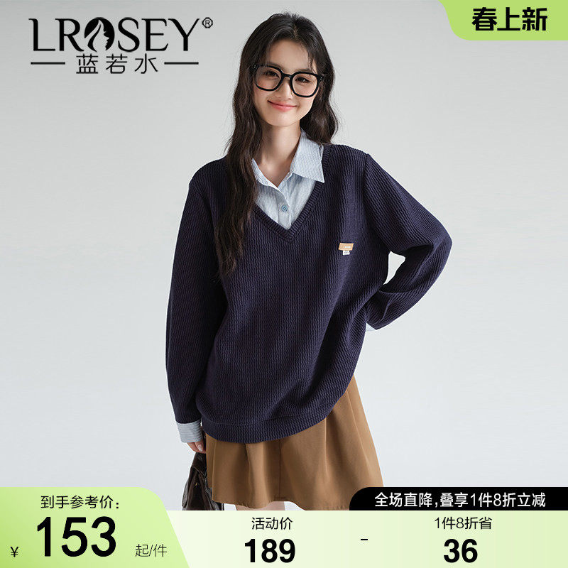 蓝若水大码女装胖mm假两件条纹翻领学院风卫衣春季新款宽松针织衫