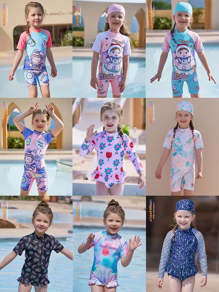 韩国新款儿童泳衣男童女孩防晒速干女童宝宝中小童连体游泳衣泳帽
