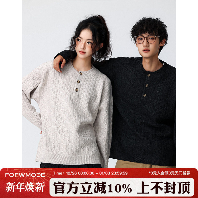 FOFWMODE秋冬季亨利领套头毛衣男女老钱风宽松慵懒麻花针织衫外套