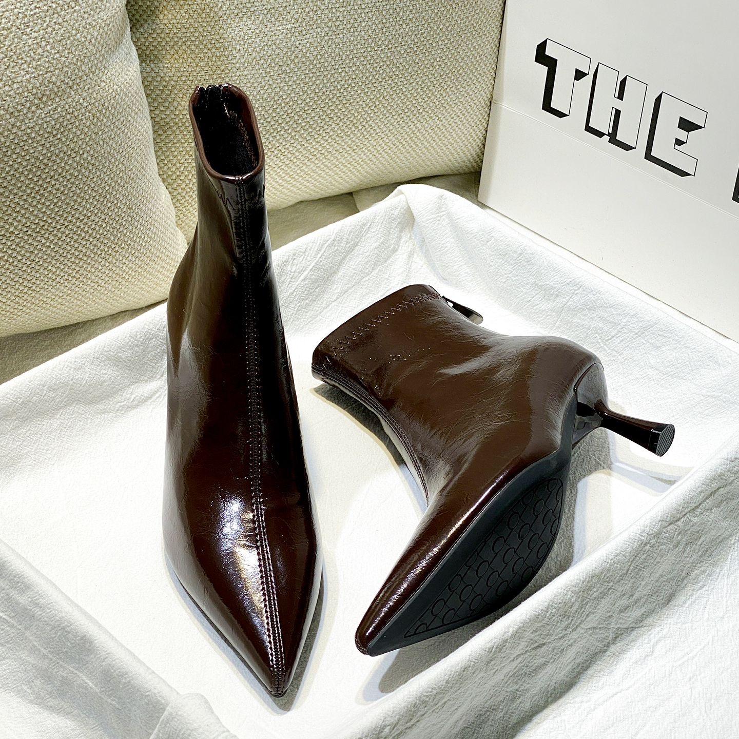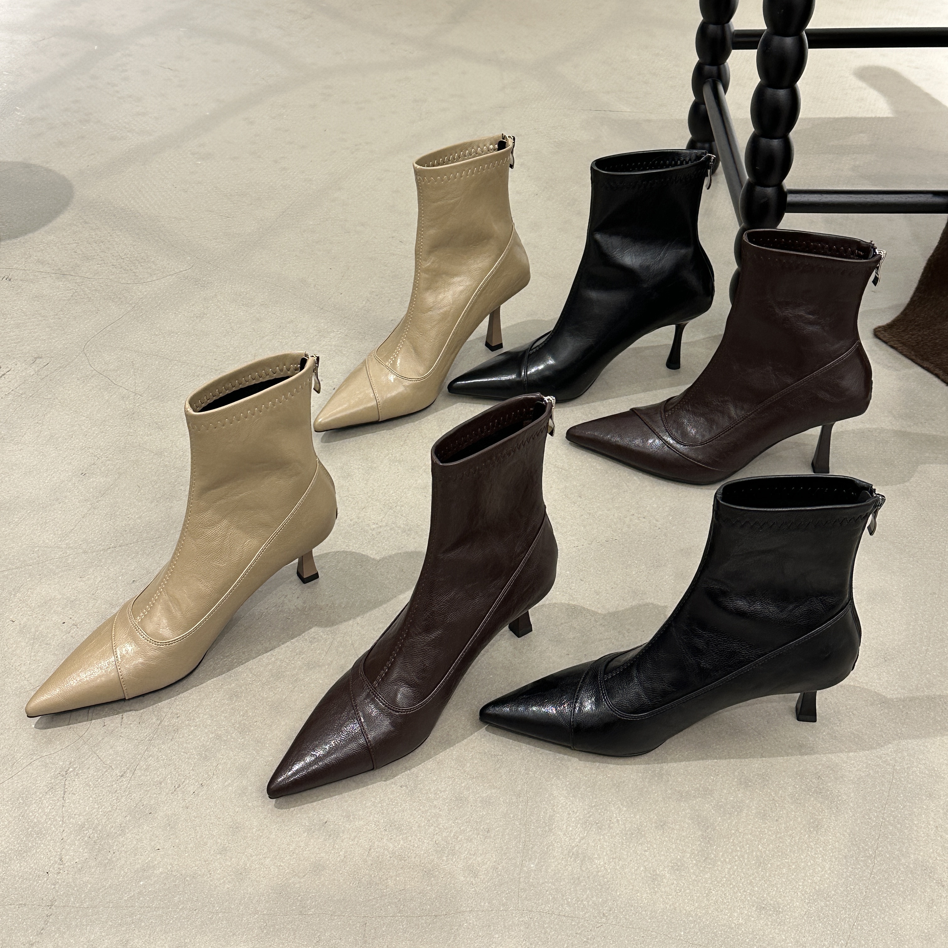 细跟尖头短靴女2025秋冬新款软皮折痕高跟短靴后拉链法式瘦瘦靴女
