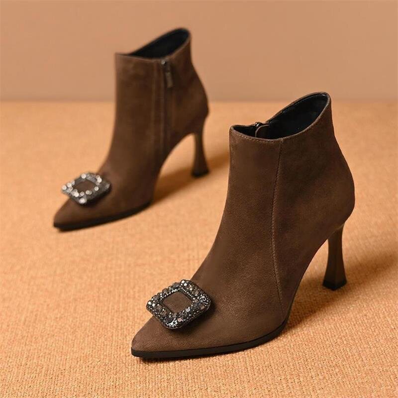 秋冬季尖头细高跟短靴女磨砂软皮水钻方扣新款韩版侧拉链百搭单靴