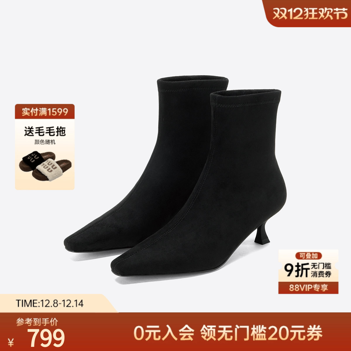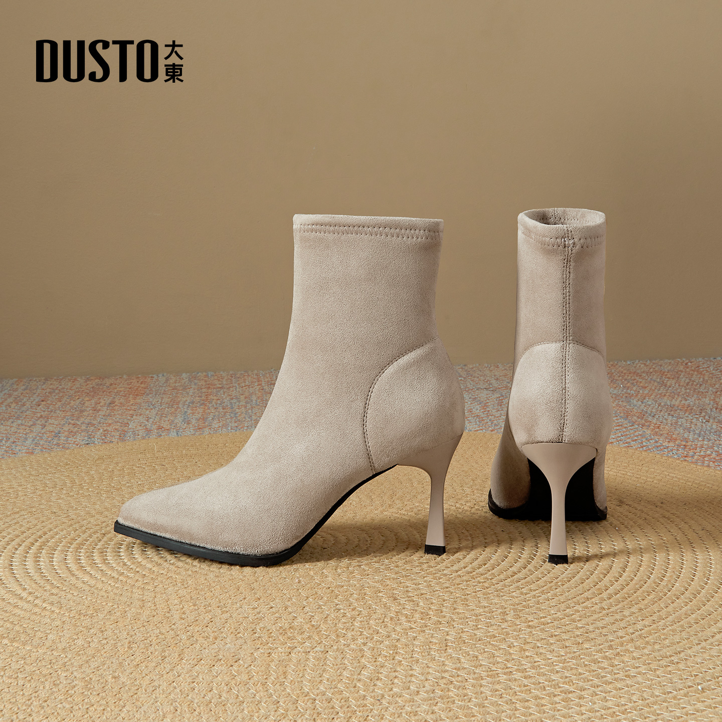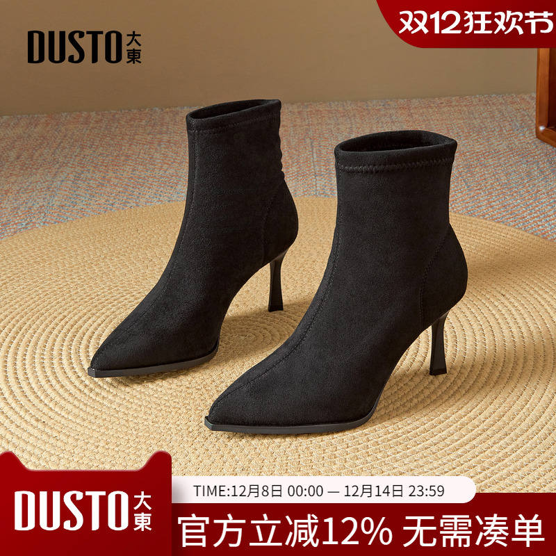 大东女鞋2025冬季新款女短靴绒面袜子靴尖头气质细高跟靴子时装靴